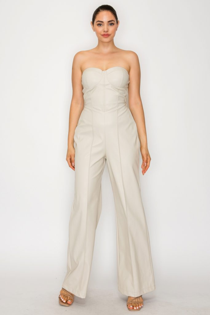 This faux leather tube top jumpsuit features a smooth, structured surface with a sleek, slightly firm touch that contours to the body while maintaining a polished appearance. The fitted bustier-style bodice is defined by visible seam lines that enhance the hourglass silhouette, while the strapless neckline with thin side ties offers a secure fit. The...